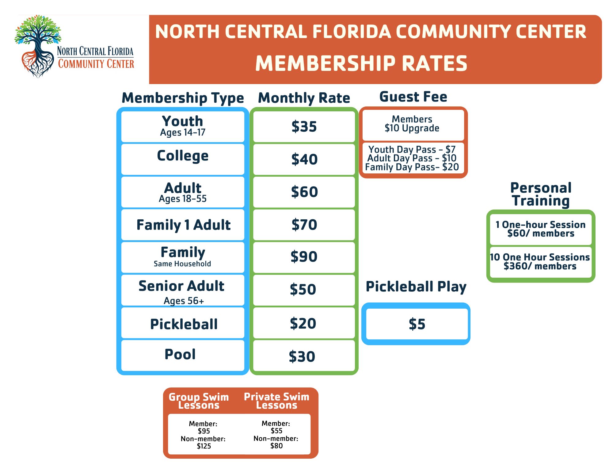 - Individuals who are not NCFCC members may purchase guest passes (up to 12 times per year). Guest passes are $7 (children), $10 (adults), or $20 (family) per visit.